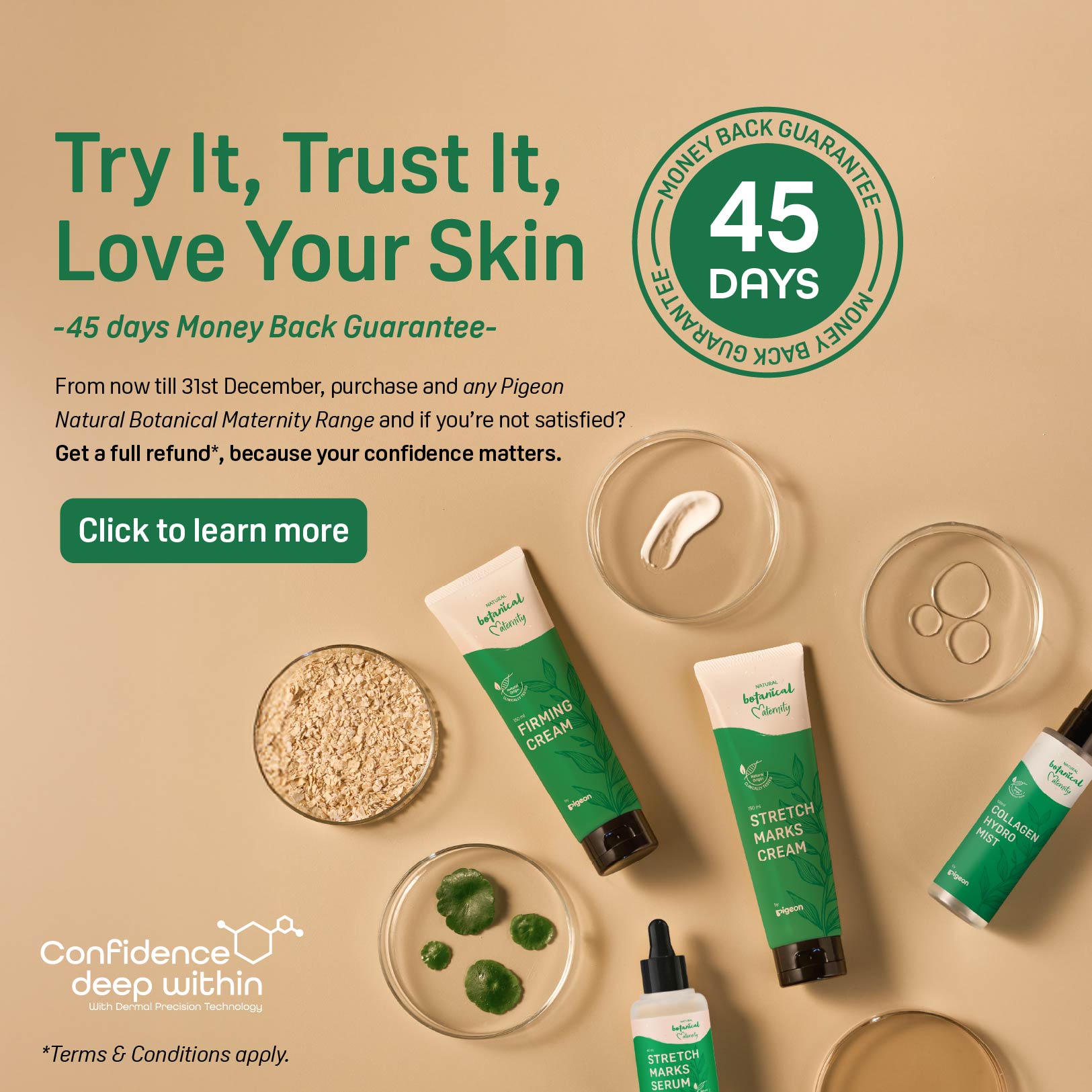 Get a full refund* with no questions asked if you're not satisfied with the Natural Botanical Maternity product(s) purchased from 2 - 31 Dec 2025 via Official Pigeon EShop. |