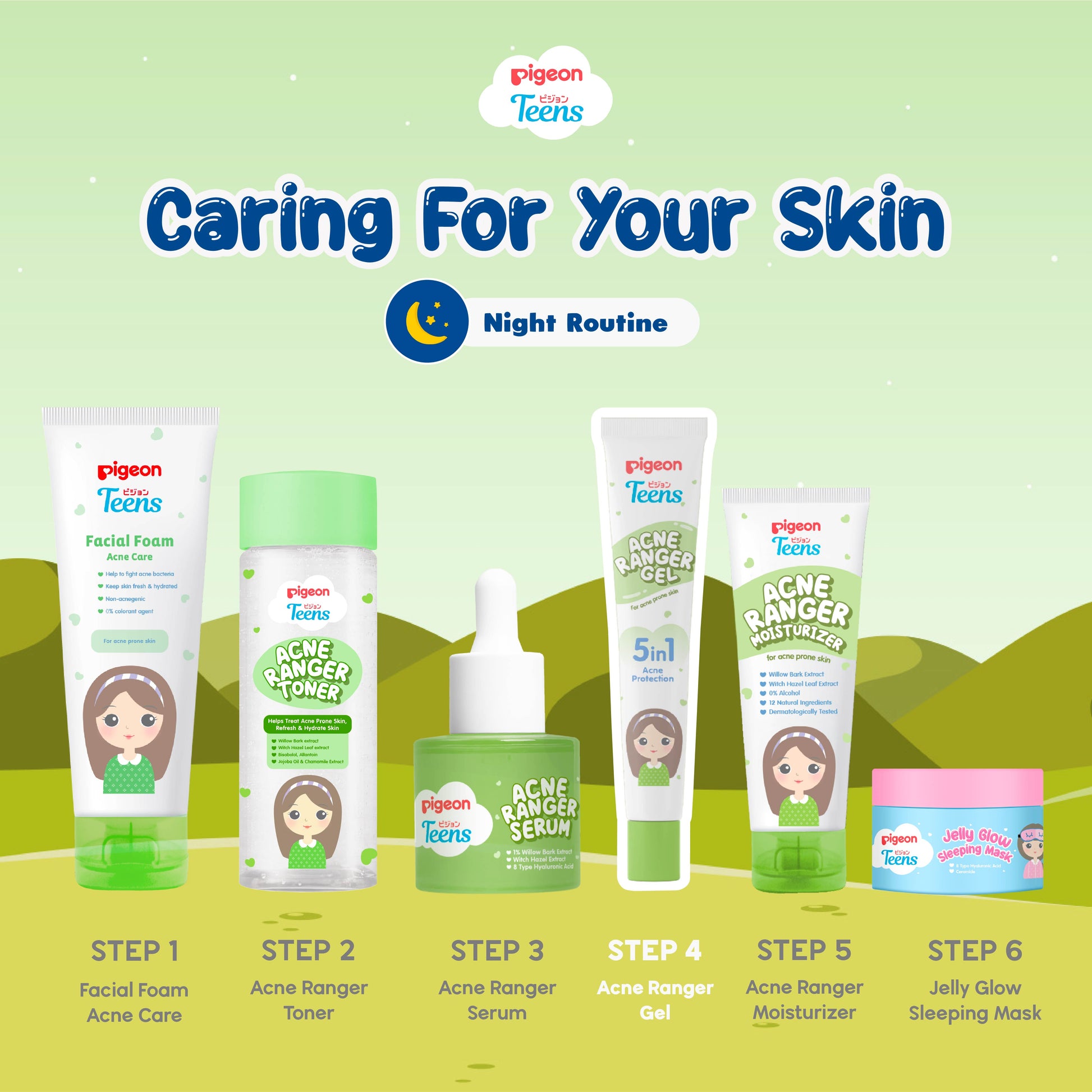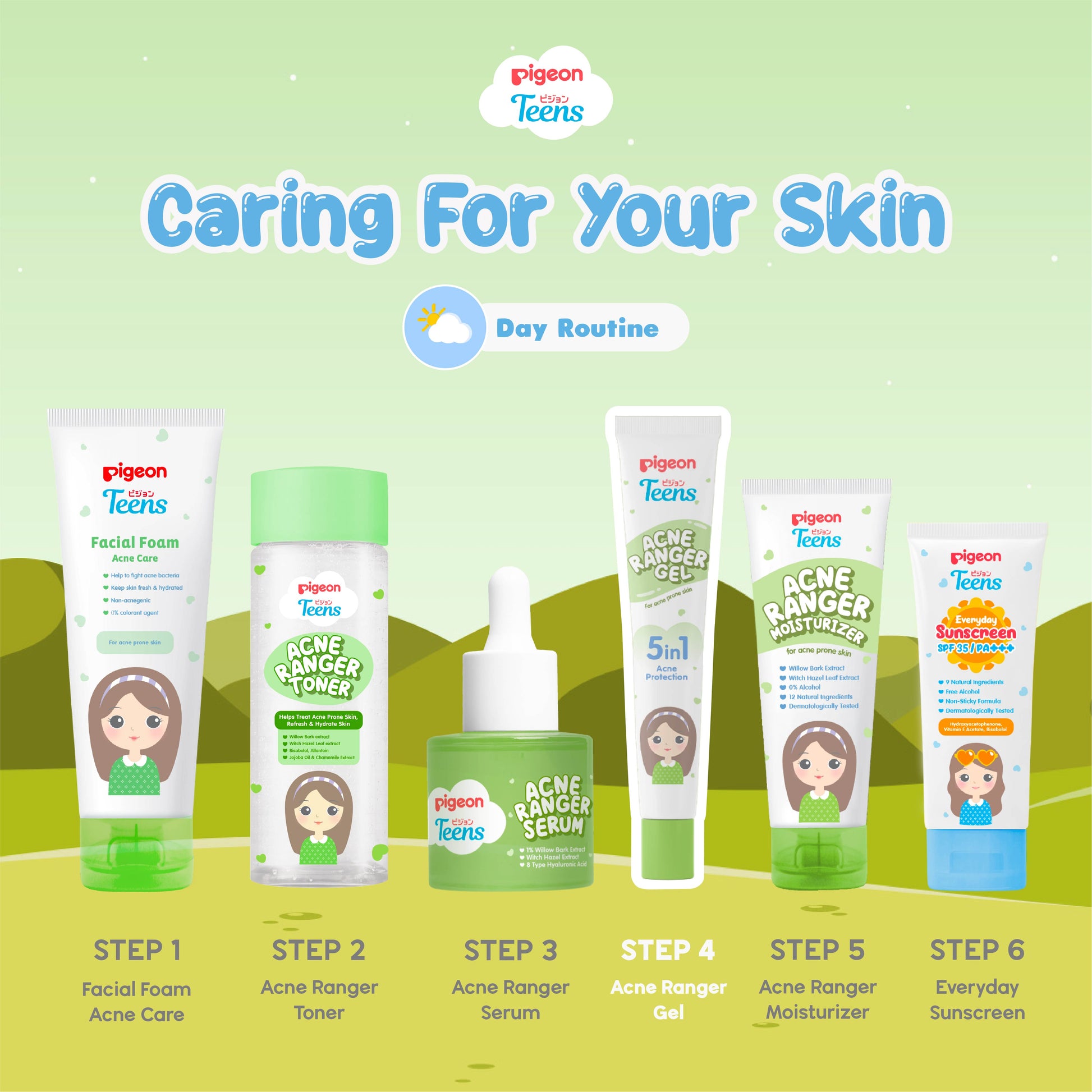 The Pigeon Teens Acne Ranger Gel is formulated with a Triple Active Formula (1% Willow Bark Extract, Tea Tree Oil, and Witch Hazel Leaf Extract) that delivers 5-in-1 Acne Protection* to address acne-related concerns.