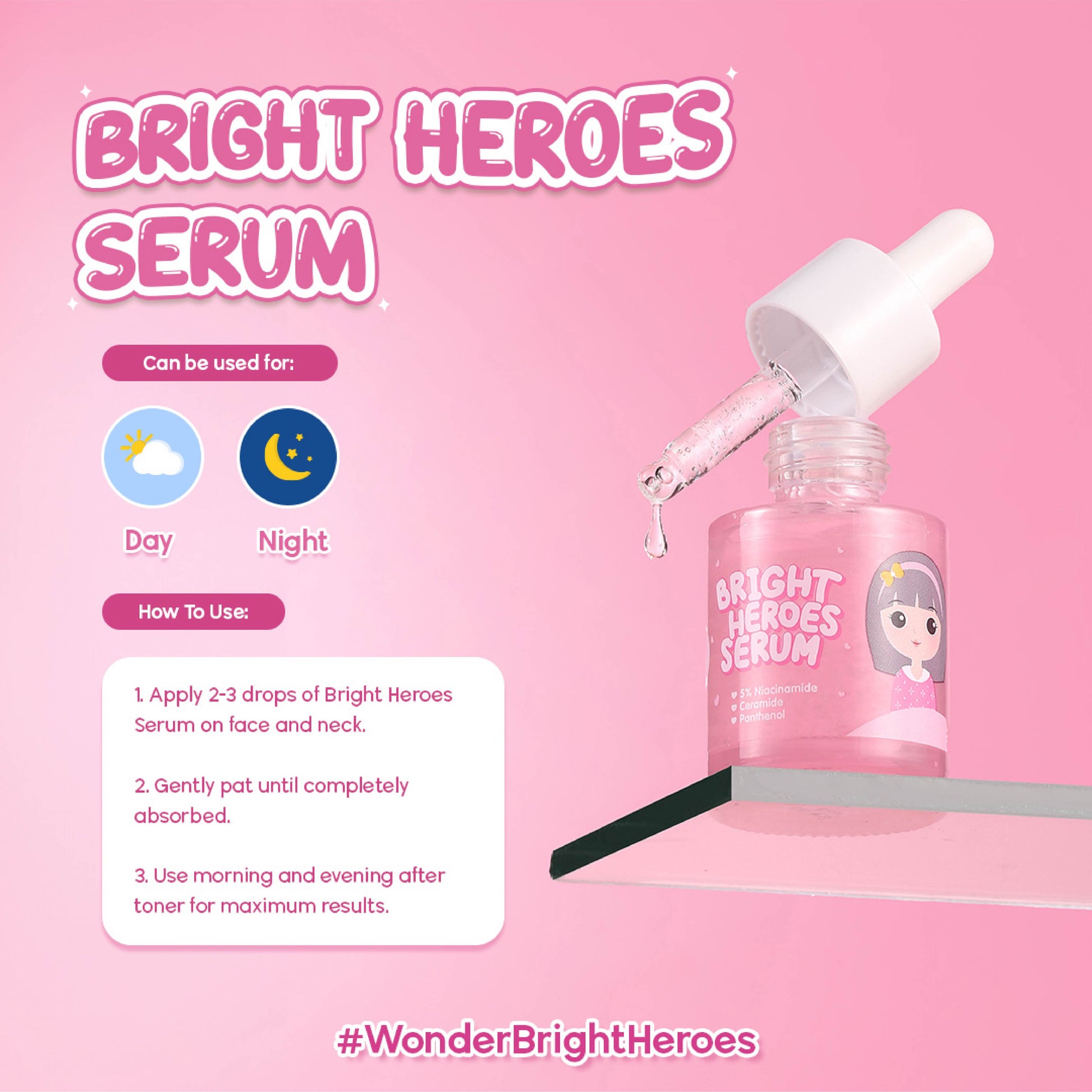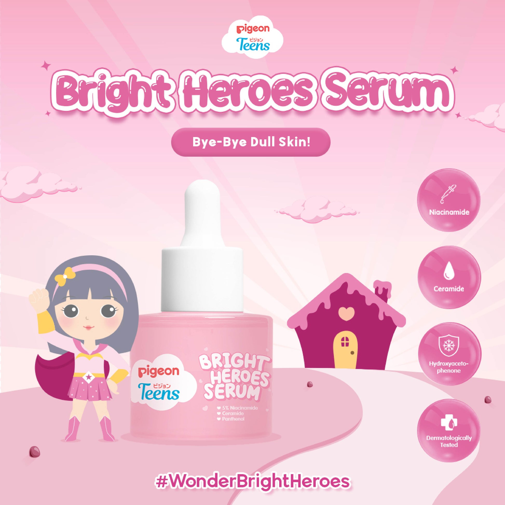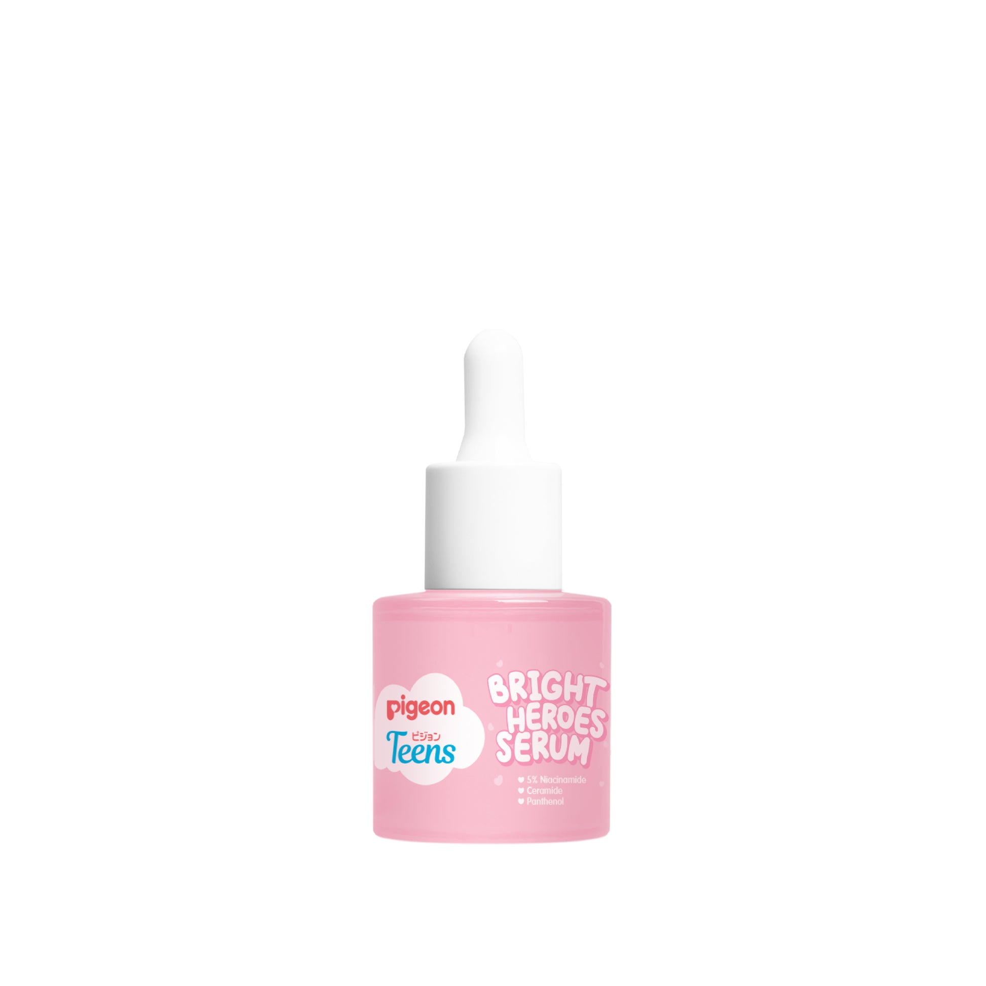 The Pigeon Teens Bright Heroes Serum is formulated with the following active ingredients (5% Niacinamide, Hydroxyacetophenone, Ceramide, Panthenol, Jojoba & Chamomille Extract) to helps brighten and glow the skin. Dermatologically tested.