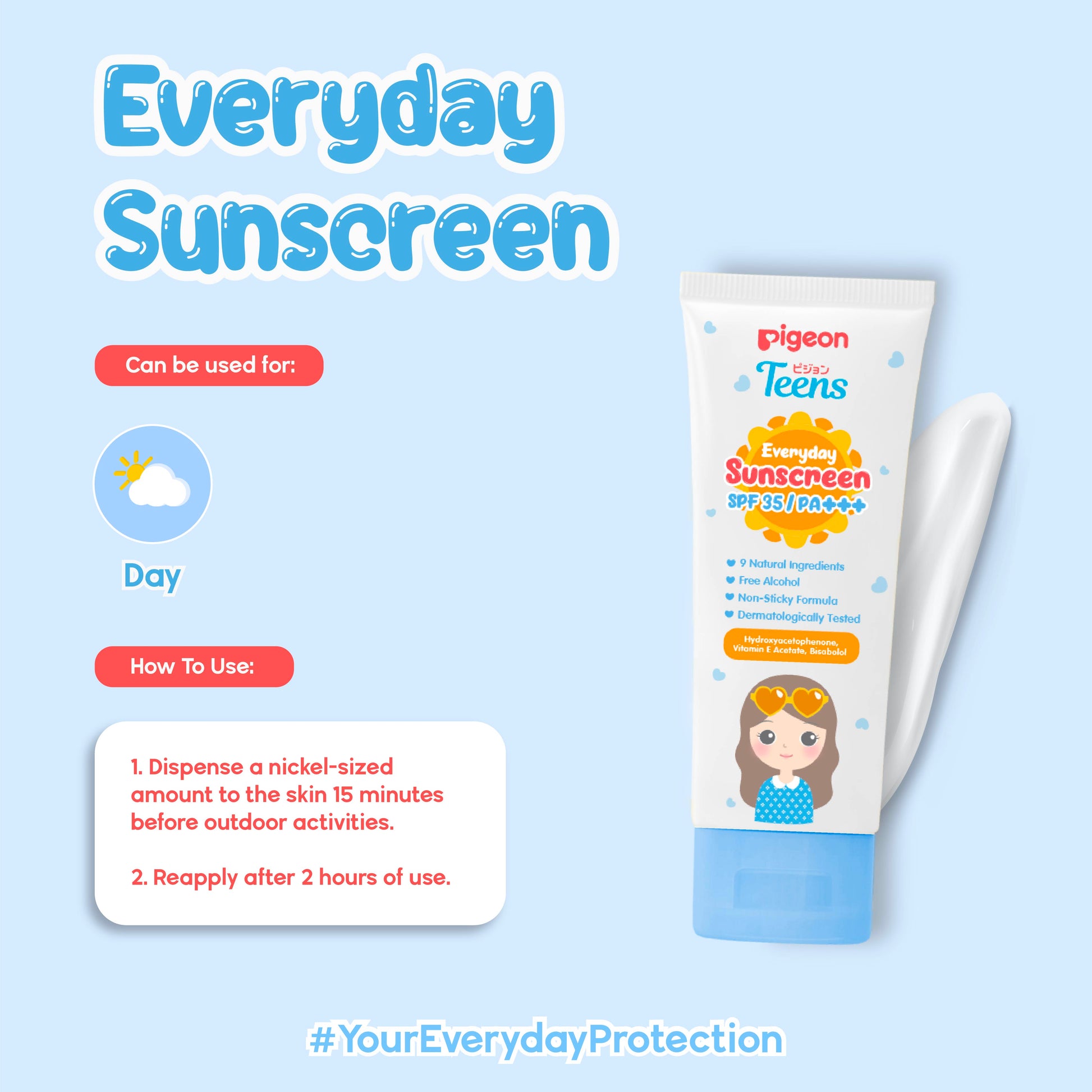 Pigeon Teens Everyday Sunscreen SPF 35 / PA+++ is formulated with sun protection agent that shields the skin from both UVA and UVB rays. Dermatologically tested.