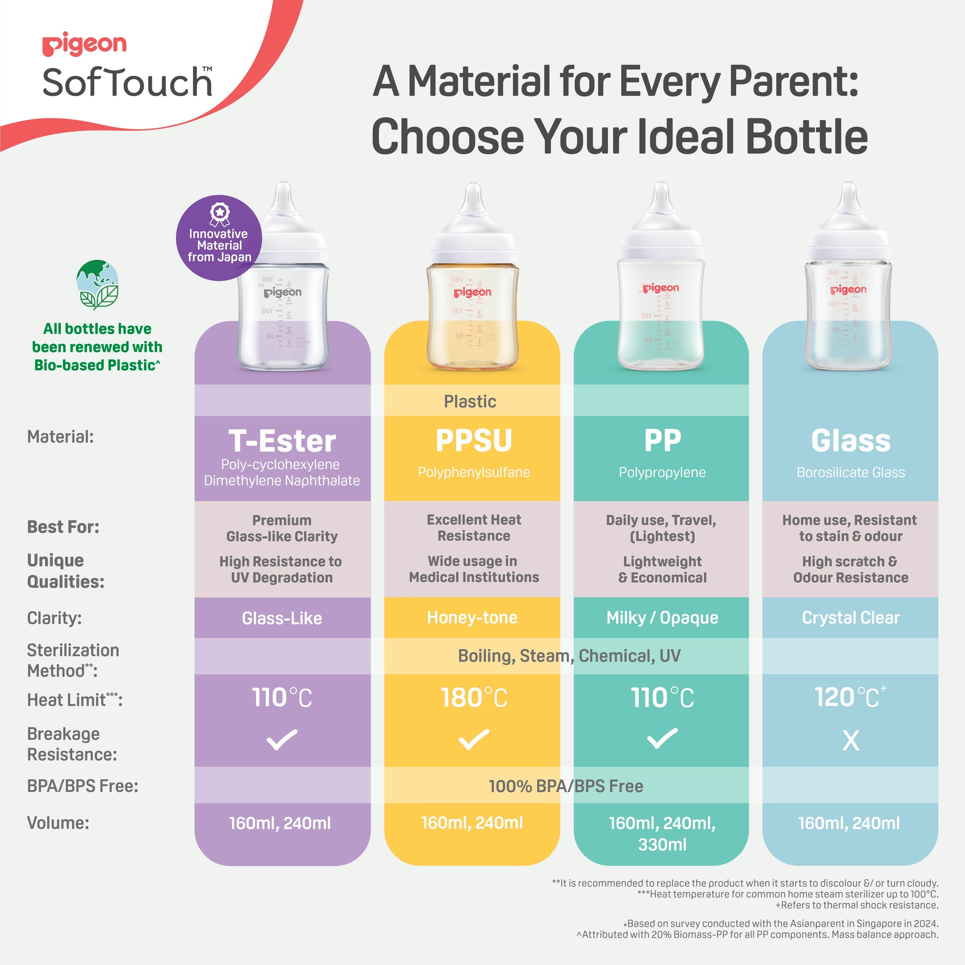 T-Ester bottle is an innovative material exclusive to Pigeon that has high resistance to UV degradation, and premium glass-like clarity. Best suited for UV-Sterilizing, making it the clear choice for quality feeding.