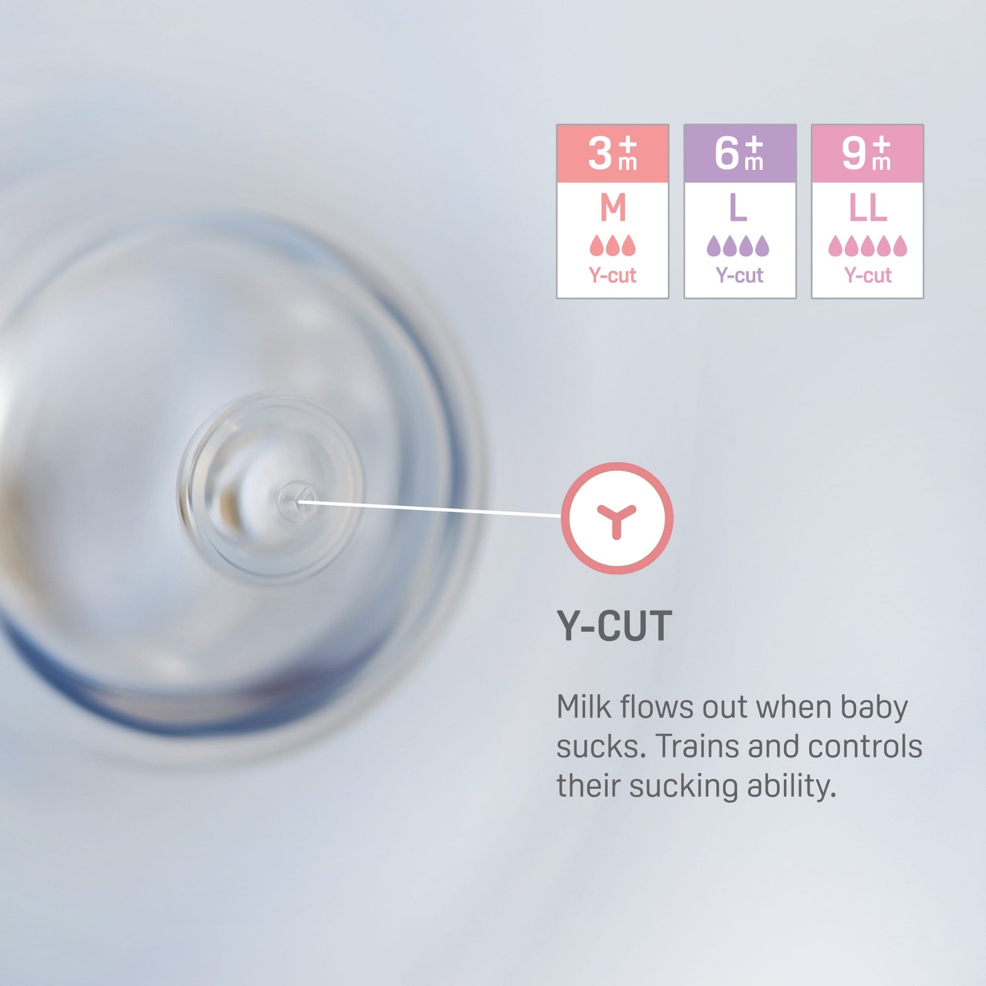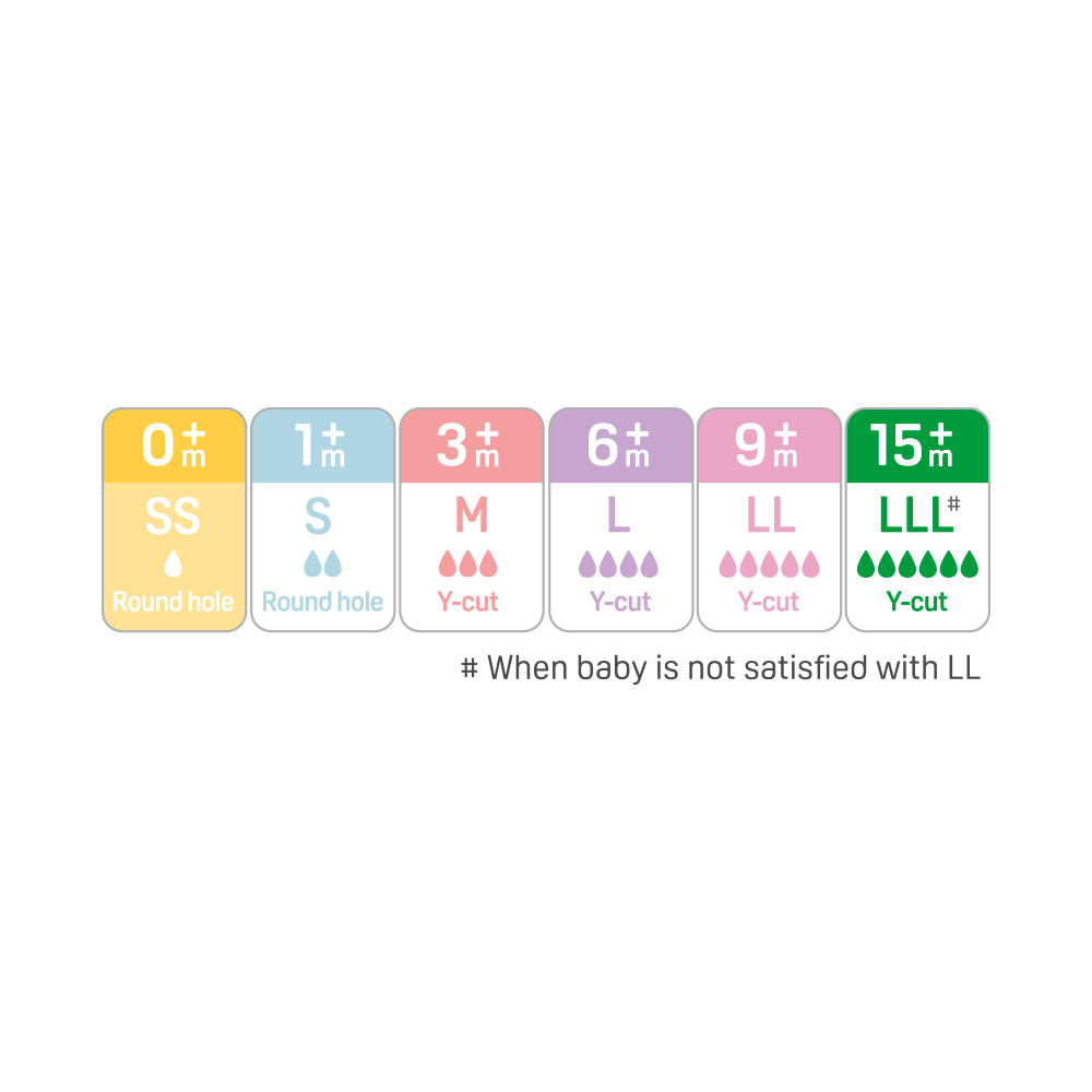 L-size nipple (Y-Cut), the opening of the nipple is slightly bigger Y-cut than M size nipple to allow more milk to drip out. Milk drips out when there’s pressure on the nipple. This helps babies to control the flow of milk and train their sucking ability as babies at this age have developed a stronger jaw muscle